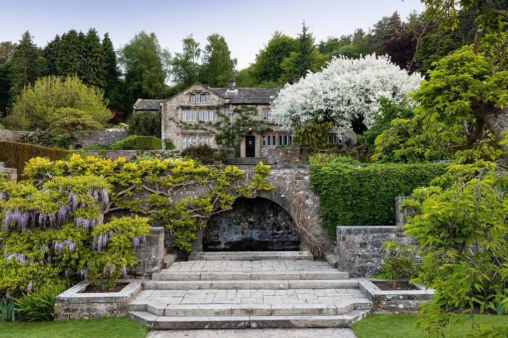 In this garden the large rounded and domed cherry tree is replicated in the shape of the pond (image 1) and the stone arch (image 2).